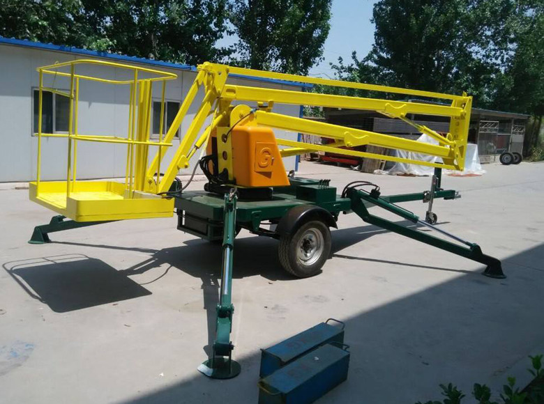 拖車(chē)折臂式升降機(jī):可以掛在汽車(chē)上,與汽車(chē)同步,適合野外高空作業(yè)。